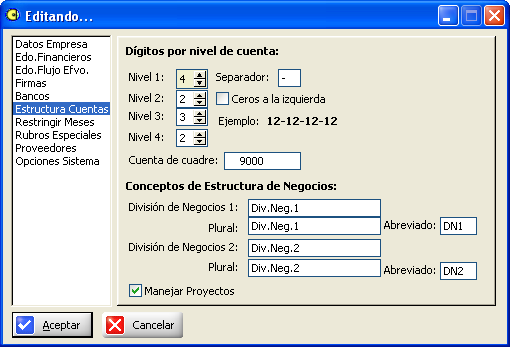 Se configura si la empresa maneja Divisiones de Negocios y/o Proyectos